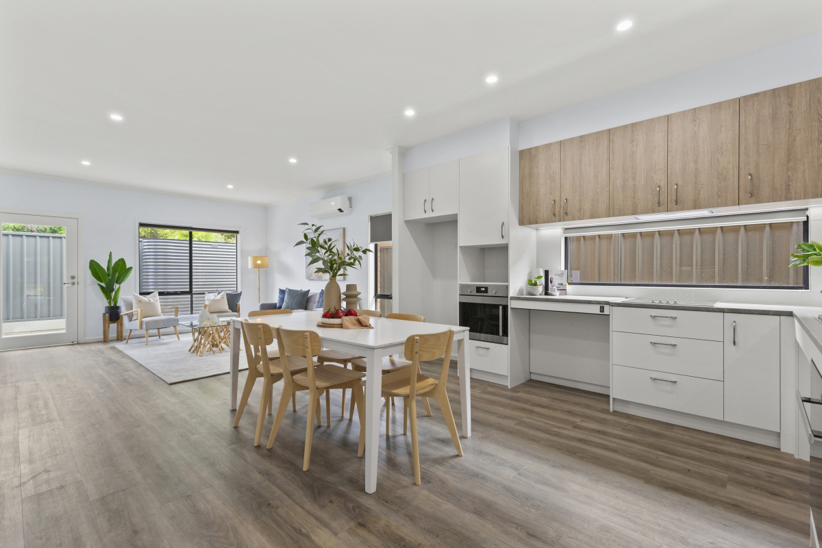 Novita Housing designs and builds fully accessible homes for people living with disability. This house, in a desirable location in Murray Bridge, includes a wide entrance front door and internal doorways, as well as stepless entries ideal for wheelchair access. 2 large bedrooms, 1 carer/support worker room, and 2 bathrooms/ensuite with rear living area make this an ideal next home for someone looking to increase their independence.