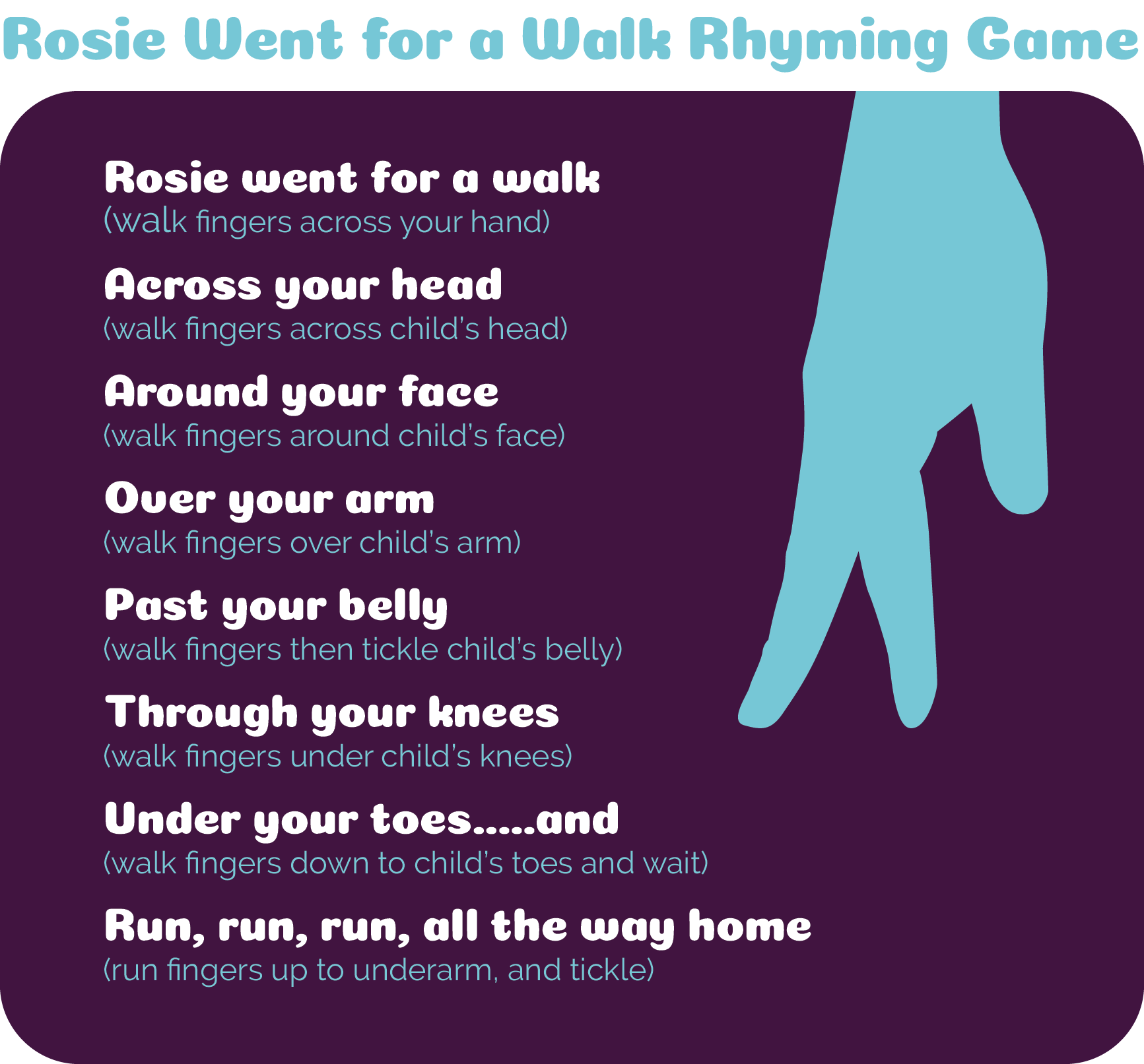 You can and should make up your own words and actions to any rhymes or song you choose – whatever your kids like best!